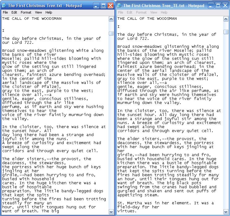 TextEbookify (c) Dan Klein (aka Schmads) TextEbookify (download) removes extra carriage returns from TXT format ebooks that were formatted for reading on a fixed width display. Typically most files like this have an extraneous newline every ~80 characters. Reading files formatted in this manner on a portable reading device tends to be irritating, as you have a lot of un-needed carriage returns breaking up your lines. Usage Please note that this is a command-line interface program. You don't have to run it from the commandline, though. You can add a shortcut to your SendTo folder or drag-drop the text file onto the executable. No installer is included (or needed), though this is a C# program built on the .NET 2.0 framework, so you'll need to get that if you don't have it already. After completion, you will find a new file next to the original one, with _TE appended to the original name. If it is unable to process the file, it will show an error. Example Approximate example simulated with Notepad using word